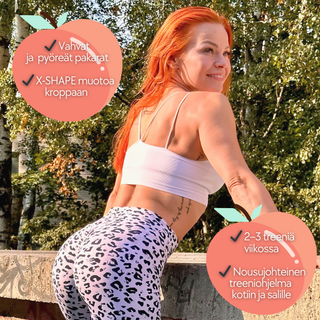 Vahvempi Sinä -valmennuksessa treenataan koko kroppaa fiksusti ja nousujohteisesti, mutta seuraavissa treeniblokeissa fokus on pakaroissa ja X-shape -mallin rakentamisessa - vain 2-3 treenillä viikossa (kotona tai salilla).