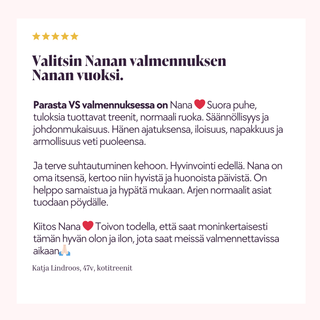 “Olen niin onnellinen, että olen löytänyt sinut! Treenasin vuosia toisen valmentajan mukana, mutta kehitystä ei tapahtunut. Vuosi sitten vaihdoin Nanan ja VS-jengin mukaan. Paras päätös ikinä! Nousujohteinen, vaihtuva treeniohjelma kotitreeneihin, huippu luentoja ja ruokavalio-ohjausta. Mitä muuta voi toivoa. Valmentajana Nana on lempeän jämäkkä, juuri sitä mitä tarvitsen. Olen ehdottomasti mukana myös ensi vuonna. Kiitos Nana, olet kultaa 💛”